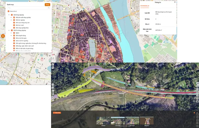 Quản lý lớp dữ liệu linh hoạt: bật/tắt theo chuyên đề, phân tích diện tích, chu vi, thống kê theo khu vực. Hỗ trợ chuyển đổi sang chế độ 3D để quan sát không gian đô thị.